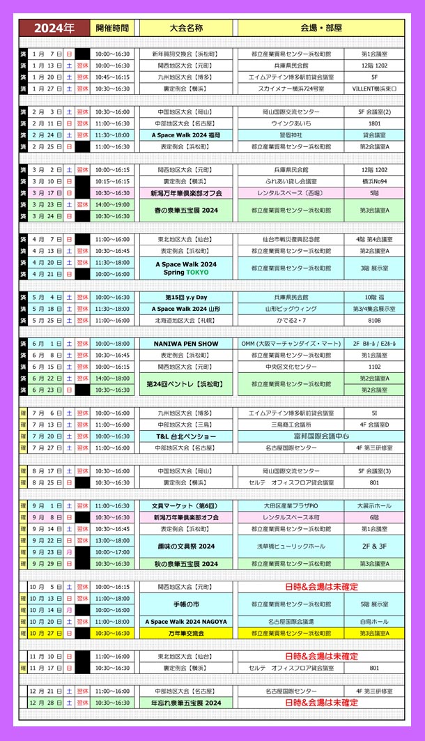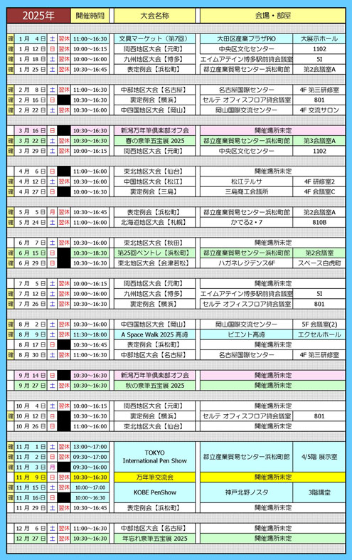 この他にも万年筆関係のイベントは多数ありますが、(y.y Day / TIPS / KOBE Pen Show / Tono&Lims / 手帳の市)とは極力重ならないように日程調整してあります