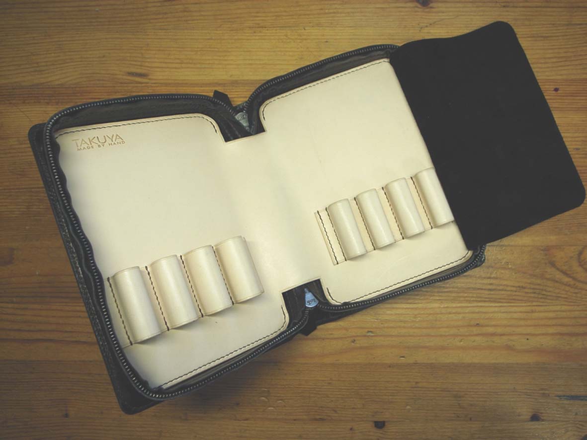 ファスナーは2本ついており、ぱっくりと2つに開ける。上と下のペンがぶつからないように、区切りとなる柔らかい皮が片方に付いている。区切りの皮を厚手の皮で作りがちだが、そうするとその皮が邪魔で全てのペンを一度に眺めることが出来ない。その点メダカモデルでは、上下仕切りに柔らかい皮を使っているのでその心配も無い。この上下仕切りの皮が一番高価な素材らしい。そのあたりにも【TAKUYA】さんのこだわりが見える。