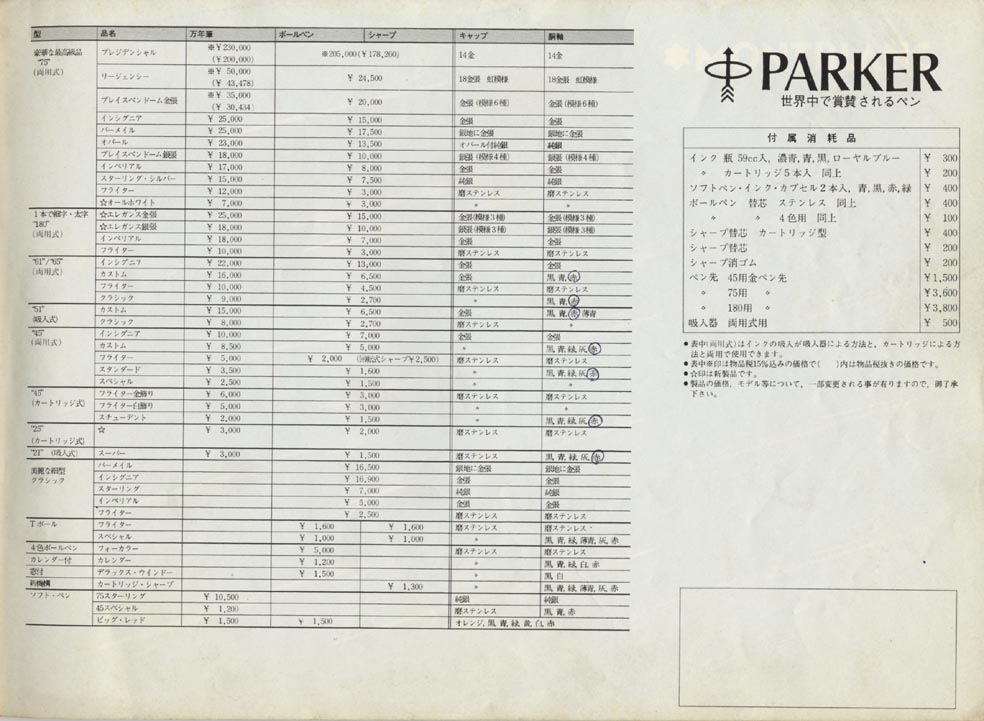 昭和51年当時のParkerのカタログ。驚いてしまったのは、Parker 180の金色、銀色軸だけで6種類のバリエーションがあったこと。ラピスラズリやマラカイトなどの漆シリーズを加えると、Parker 75と同程度のバリエーションを持っていたことになる。値段もほとんど同じ。Parker 180はかなりの自信を持って日本市場に投入されたようじゃ。 結果は惨敗・・・かな?