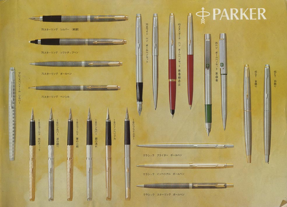 Parker 25がカタログに掲載されていてビックリ!国際空港のDFSのお土産で売るのがメインかと思っていた。この万年筆はステンレス製のガチガチのニブだが調整すると書き味が激変! またユーロボックスにあるかもしれん。一時、大量に在庫があった。ペンシルはポキポキ折れて大変だった記憶があるが、ボールペンと万年筆は格好よかった。英国Parkerの作品だったかな?