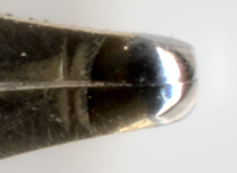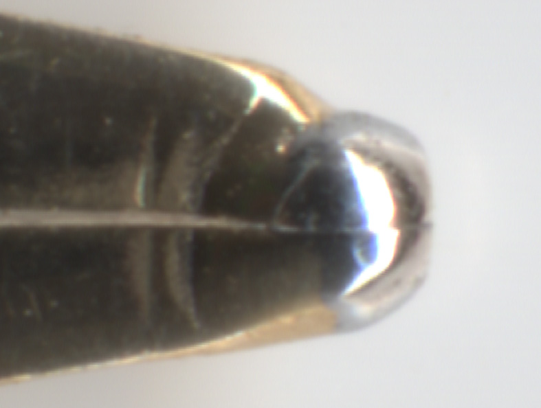 今回の調整依頼事項は、ペン先の形状が左右不揃いなので矯正する事、ややカモノハシ気味にして柔らかい書き味にすることじゃ。実はイリジウムの切割りが前から見て異常に右斜め下向きに入っている。これは切割りを入れる際にペン先が斜めになったままヤッチマッタ・・・ためじゃろう。これも矯正依頼となっていたが、さすがにコレは無理じゃ。従ってやや目立たないような細工をするにとどめた。今回の調整はイリジウムの矯正に絞って報告する。