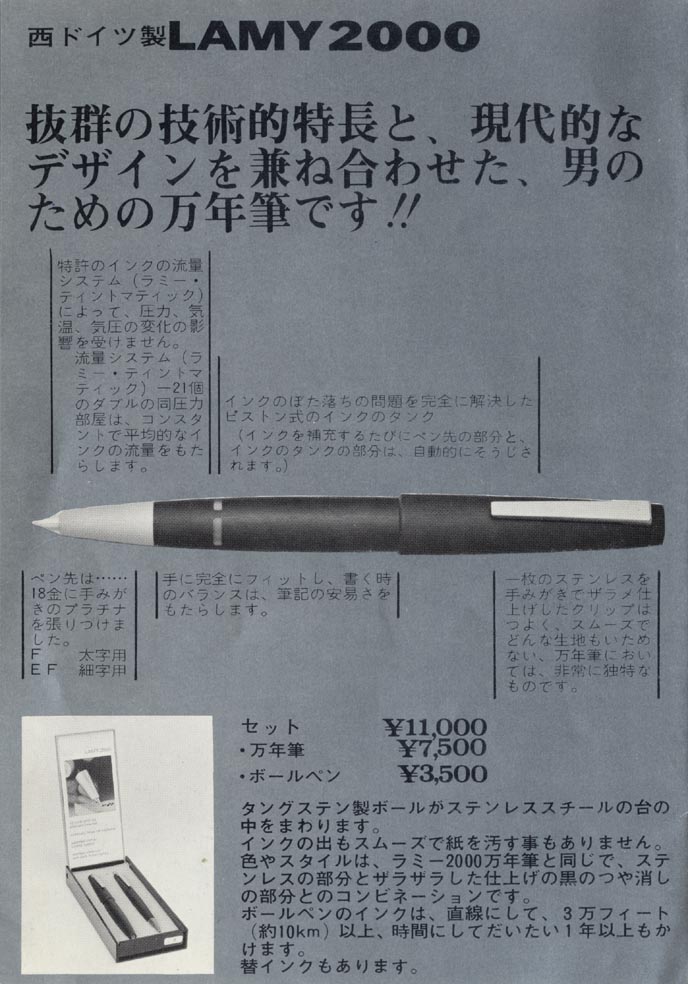 いったい何時の時代のカタログだろう? LAMY 2000 が7500円とは!過去に紹介した【昭和51年のTHE PEN】ではLAMY 2000は9000円だったので、それ以前ということになる。