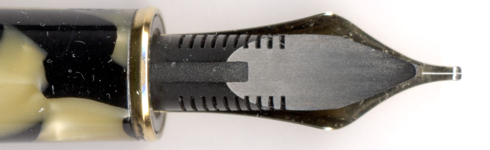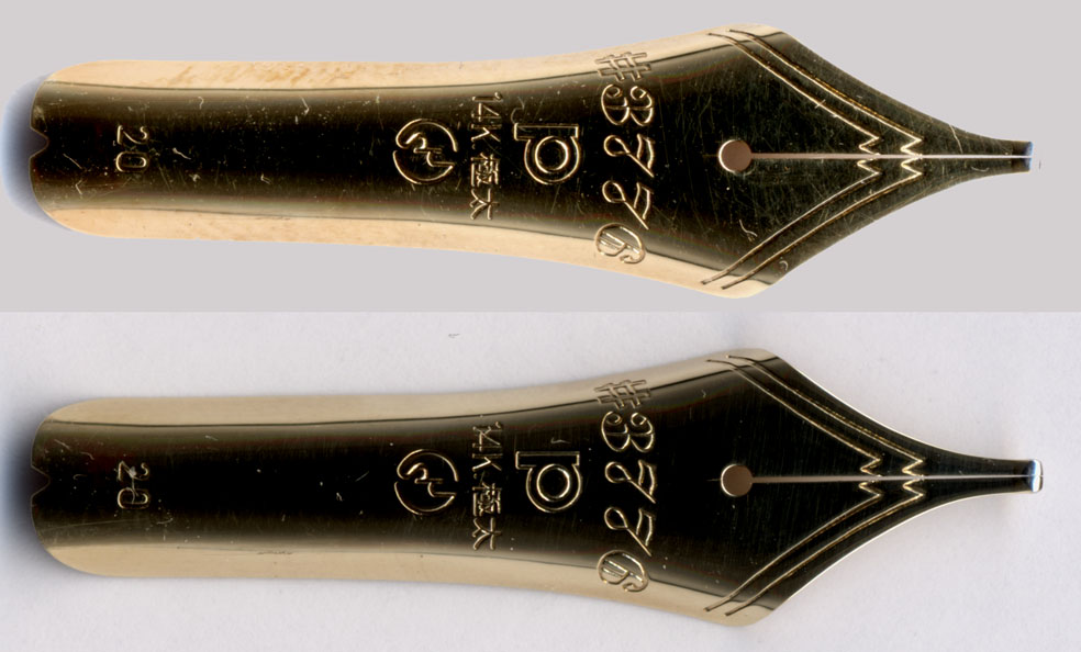 さらに書き出し掠れをなくする為には、ペン先をより鋭角に研ぎ、stand_talkerしゃん曰くの【ピントが合った状態】にする必要がある。紙に当たる部分が筆記時に意識でき、その中で意識の線と実際の筆跡が一致すれば気持ち良いし、掠れる確率も小さくなる。そこで左の画像のように、かものはし調整にペン先を研ぎ上げた。
