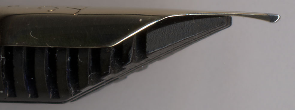 ペン先の拡大画像。これでみるとNo.25Xシリーズの書き味の秘密がわかる。ペンの背中は真直ぐなのに、内側はイリジウム先端に向かって急激に厚みを増している。これはペン先本体の堅牢さを角型に曲げることで出して、金ペンを薄くし、金の使用量を減らす。ただしイリジウムはしっかりと固定するために、イリジウム付近の金は厚めに成形する。結果として、ペン芯先端からイリジウムまでがピコピコと柔らかく動くという独特の弾力を演出出来たわけじゃ。