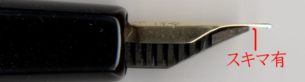 インクフローが悪い原因の一つに、イリジウムの詰まりすぎがある。これは毎回指摘しているが、毛細管現象に頼りすぎるあまり、インクフローを犠牲にしているように思えてならない。下がスリットを拡大したあとの図。簡単に拡げているように思うじゃろうが、イカペンのスリットの詰まり具合は手ごわい。1950年代でも1960年代でも、手から血が出そうなほど力を入れないと思うような変形が出来ない。素人にいじらせない事を前提に作られているのだから仕方あるまいが・・・