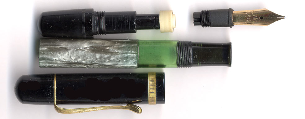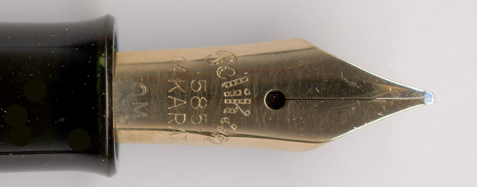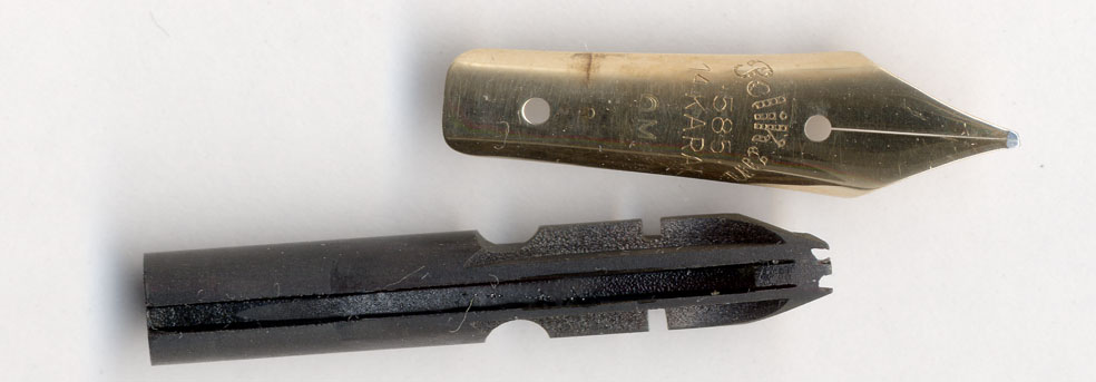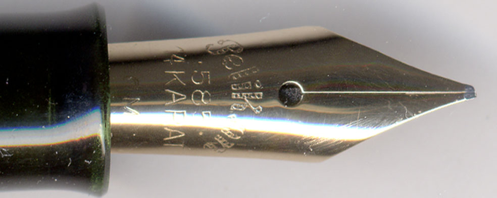 症状はインクが時々切れる・・・そうじゃがペン先調整は完璧。OMの特徴を残しながら綺麗に研いである。ペン先とペン芯の隙間も標準的で、何ら問題は無い。首軸の形状にも問題は無い。蛇足じゃがPelikan 100の復刻品:Pelikan 1931などの限定品は、インク漏れに注意じゃ。首軸先端の円周がキャップ内部の円周とほとんど同じの物がたまにある。キャップを締める時に息が詰まっていくような感覚。これが実に良いのじゃが・・・キャップを外すと大量のインクが首軸に附着するケースが頻発する。これは首軸先端がポンプ弁の働きをして、キャップを外す際に軸内からインキを吸いだしてしまうから。この対策は簡単で、首軸先端をペーパーで削ればよい。キャップを締める際に息が詰まるような感覚が無くなるまで削るのじゃ。