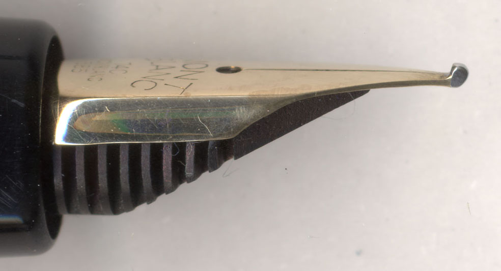 依頼品の状態は非常に綺麗ですばらしいのだが、ニブだけがまずい状態になっている。ペン先は詰まってはいないのだが酷い背開き状態で、左右の段差も大きい。このまま書いてもあちこちが引っ掛って書き難い。ちゃんとしたVintage Shopを通して入手すればこのあたりは100%調整済になっているのじゃが、オークションではえてしてこういうのに当たる確率が高い。