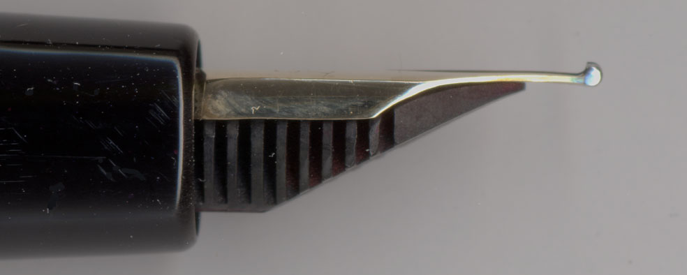 ペン先の調整状態はめちゃめちゃだが、このクーゲルは立派。こんなに派手な状態のクーゲルに出会ったのは初めてじゃ。画像ではうまく表現できてないが、まさにトサカというかサイの角というか・・・とにかく立派じゃ。まったくプロの手で調整されていないペン先の魅力はこういうところにある。元々どうだったのかを知りたくなった場合、調整したものしか見ていないとあらぬ妄想を膨らませてしまうことになる。このイリジウムも腹はすぐに削ってしまったので、この画像が見納めじゃ。