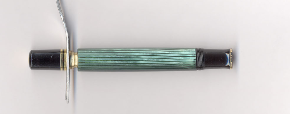 今回の依頼品は調整ではない。修理じゃ。物はPelikan M800。ペン先は14C-M。M800は発売当初14Cのペン先と18Cのペン先があった。1988年の輸入筆記具カタログを見ると、14金バイカラーペン先付が4万円、18金バイカラーペン先付が4.5万円となっている。1994年のカタログでは18金バイカラーペン先付のみとなっている。ちなみにその時の価格は5.5万円。