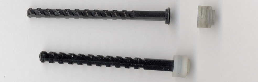 そうしたところ、左図上のように弁の部分が芯の部分と離れ離れになってしまったのじゃ。弁の周囲が摩擦によって劣化し、そのカスば筒と弁との間に入って動きが悪くなっていたと思われる。それを力ずくで上下させているうちに、弁の内部で芯を押さえている部分が千切れてしまったらしい。