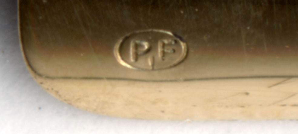 ルーペで拡大してみると【P.F】ではないか!しかも通常はペン先の内部から外側に向かって刻印してあるが、これは外側から内側に向けて刻印してある。
