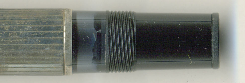 首軸先端の拡大図。ここに、この純銀モデルが2万円で売られていた秘密が隠されている。素通しインク窓の純銀モデルに、14K-BBのペン先はありえない。ソリテールと呼ばれる金属軸は全て18金ペン先がついている。しかも首軸先端がラッパ型に開いている。正しくはヘミングウェイと同形の非ラッパ型の首軸先端部品であるべき。