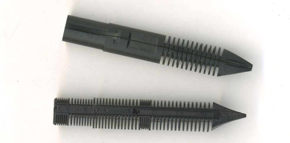 左画像の上が本来付いているべきエボナイト製ペン芯で、下がこの万年筆に取り付けられていた現行No.146と同じプラスティック製ペン芯。内部構造を見ると明らかにプラスティック製の方が凝っているが、凝らなければならない理由もある。【インク誘導液】なるものがあるが、あれはエボナイト製ペン芯には不必要なもの。インクとなじみにくいプラスティック製ペン芯に使うらしい。とすればエボナイト製ペン芯の方がインクとなじみやすいわけじゃ。