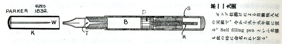これは尻軸に開いた穴から空気を入れてインクを出すしくみ。さすがにこのころには、空気が入らないからインクが出ない!ということはわかっていたようじゃな。それにしてもフォールシュによって初めて萬年筆の特許が出されてから70年以上経過している。その間の技術進歩の遅さにびっくり!