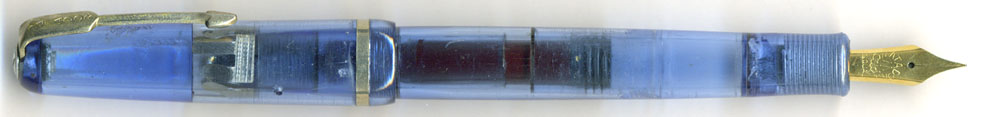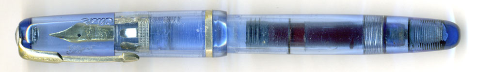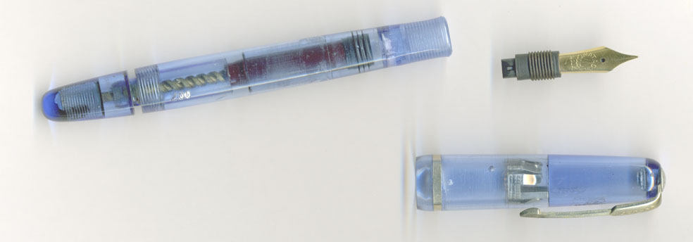 かなり使い込まれて内部に傷がついている部分もあるが、Demonstratorのルールを守っており、インクを入れた形跡は無い。ペントレなどでDemonstratorを展示していると、インクに浸けて試し書きする人がいる。これは絶対にやってはいけない事じゃ。首軸内部は加工が複雑で、Pelikanなどでは2個の部品を接着剤で貼り合せている物もある。そういうものをインクに浸せば接着剤が着色して、あわれDemonstratorは一生汚れを背負って生きていかねばならない。