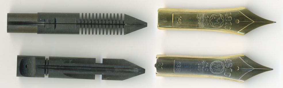 両者のペン芯を比べてみると70年代物の方が長い。一般的には長いほうがインクフローは安定している。ペン先の長さはどちらも同じようなもの。若干70年代のニブの方が長い。こちらは長いほど首軸の中でホールドされる面積が広いのでぐらつきにくい。いずれにせよ形状からすれば誤差の範囲なのでなんとかなろう。