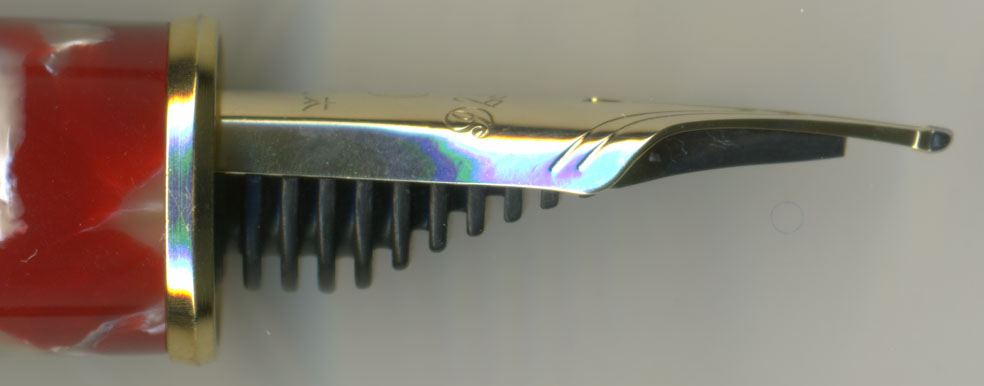 真横から見た画像。これでオヤっと感じた。もう少しお辞儀させた方が良くないか?しかもペン先がペン芯よりも若干浮いている。