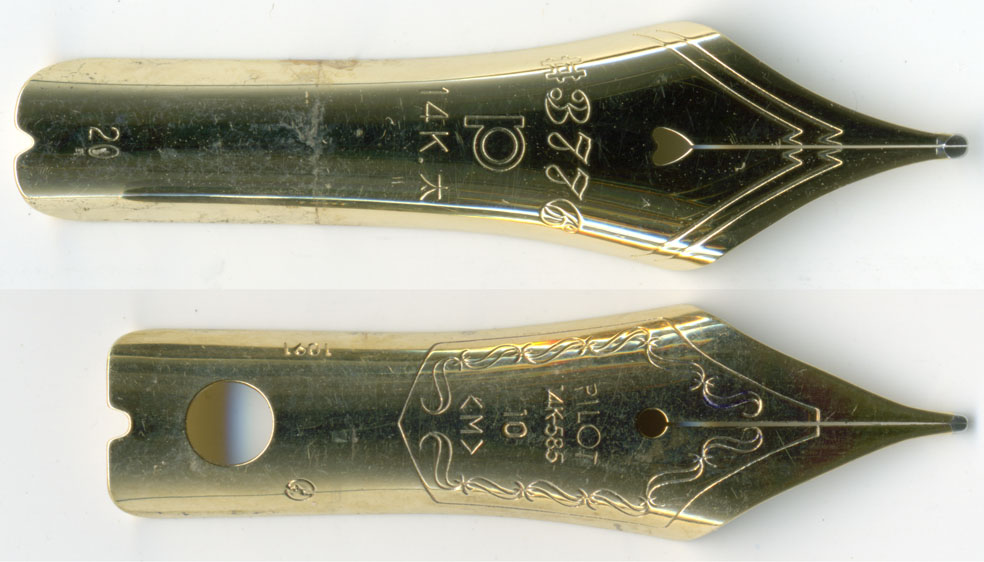 話は脱線するが、何故プラチナのニブがグラつかず、首軸から抜けにくいかをお見せしよう。下はパイロットの10号ニブ。比べてみると上の#3776のニブの方がはるかに長いのがわかろう。これだけの長さが首軸内の隠されているからこそ、グラつかないし、抜く時大変力が要るわけじゃ・・・