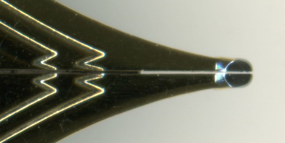 この二ブ先端部分の拡大図。太字のペン先の先端はちゃんとスリットが開いている。最近は国産、海外物ともおしなべて先端のペンポイントを密着させる傾向があるが、実際にはこれくらい離れていた方がインクフローが良く、気持ちよく書ける。