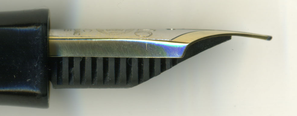 こちらは横顔。1950年代後半の厚いペン芯。こちらの方が丈夫でインクのボタ落ちも少ないが、ペン先のカーブに合わせてペン芯を曲げる作業は極端に難しい。作業性から言えば、初期のフラットフィーダーの方が断然良い。メーカーもそれを知った上でモデルチェンジしたのであろうから、フラットフィードにはよほど大きな問題が潜んでいたのであろう。ただそれは未だに拙者の知るところでは無い・・・