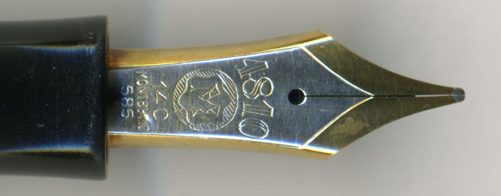 ペンポイントはMだが、上から見るとやや丸みを帯びている。これはこの当時好まれた調整かもしれない。拙者の好みからすれば、開高健モデルのNo.149-Mのようなエッジの立った【M】の調整にしたいが、依頼者の趣味とは違う感じがしたので止めておいた。