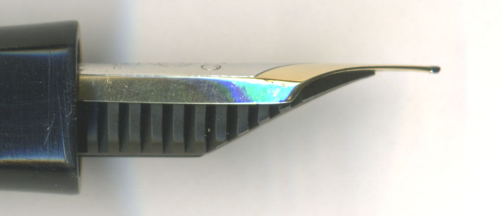 こちらは横顔。拙者の調整は少しペン芯からペン先が前に出すぎでは・・・という声が出る直前くらいにしている。通常よりはかなり前進させている。昔はペン芯とペン先が密着する面積が大きいほどインクフローが良いと考えていたが【萬年筆の科學】を読んでから気が変わった。