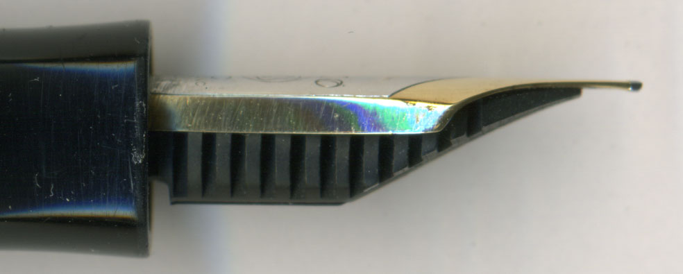 こちらが調整前の横顔。後期の厚いペン芯が付いている。見映えは圧倒的に前期のフラットフィードが良いのだが、インク漏れ対策などでは後期ペン芯の方がやはり優れている。また温度変化によるペン芯のゆがみも少ないので安心は安心。ただしペン先の微調整用にペン芯の方をお湯で曲げて・・・という際には非常に力がいる。フラットフィーダーならすぐに曲げられるが、厚いペン芯ではそうはいかない。ペン芯を削って微調整した方が曲げるより楽じゃな。