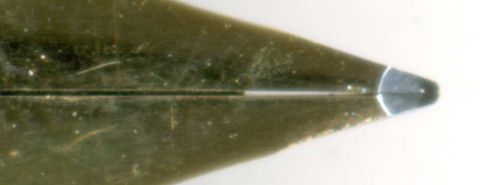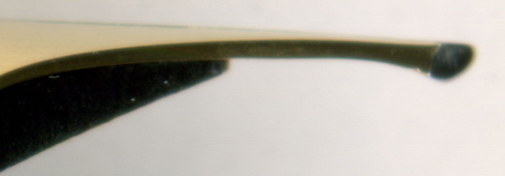 ペン先先端を斜め下から見た画像じゃ。如何に酷い削りかわかろう。ペン先の両端をヤスリでガリガリ削ったうえ、先端部も真っ直ぐ斜めに削ってある。これはサンドペーパーで削ったとしか思えない。