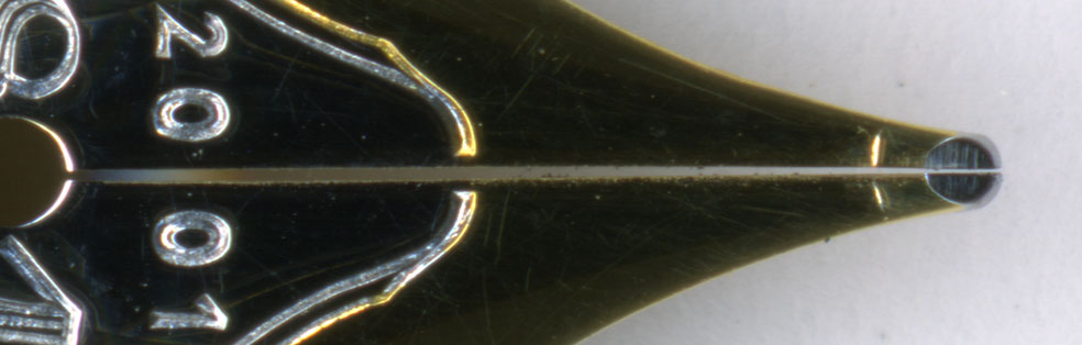 ペン先の状況を確認すると、ペン先のスリットは密着している。これではインクは出ない。ただし背開きというのは依頼者の誤解で、まったく問題はない。またペンポイントの丸めも完璧で、購入当初から、そこそこの書き味が堪能できる。