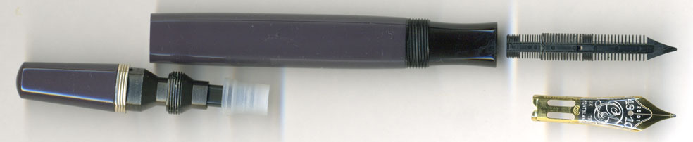 分解してみると、ペン芯は現行品と同じ。根元が若干細くなっているタイプ。気のせいか、これ以前のヘミングウェイ縮小版タイプのペン芯より、若干インクフローが悪い・・・。インクボタ落ち確率は減ったはずだが、インクフローが悪くなってはなぁ・・・マニアは喜ばない。