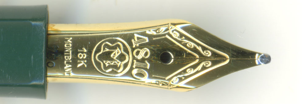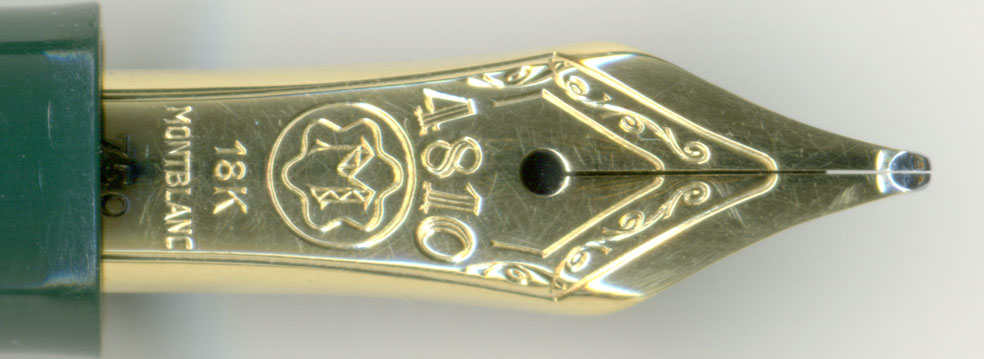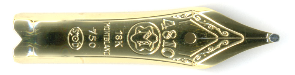 ペン先の拡大画像を見ると、果たしてスリットはガチガチに詰まっている。しかし・・・美しいペン先じゃ。無駄な装飾が無くて引き締まっている。ペンポイントの形状にも破綻がない。ここ数年のMontblancのペンポイントへの力の入れ方には感心してしまう。Montblancの総合ブランド戦略は萬年筆愛好家からは何かと批判されがちだが、どっこい萬年筆の命ともいうべきペンポイントの研ぎはすばらしさを増している。その充実した萬年筆を生かすも殺すも店頭での接客次第。如何に商品知識を売るかが大事じゃ。まずは萬年筆を好きになって欲しいな・・・