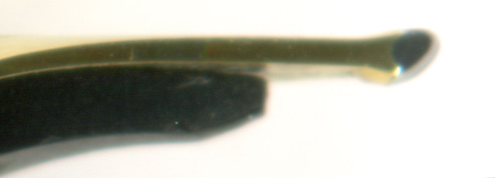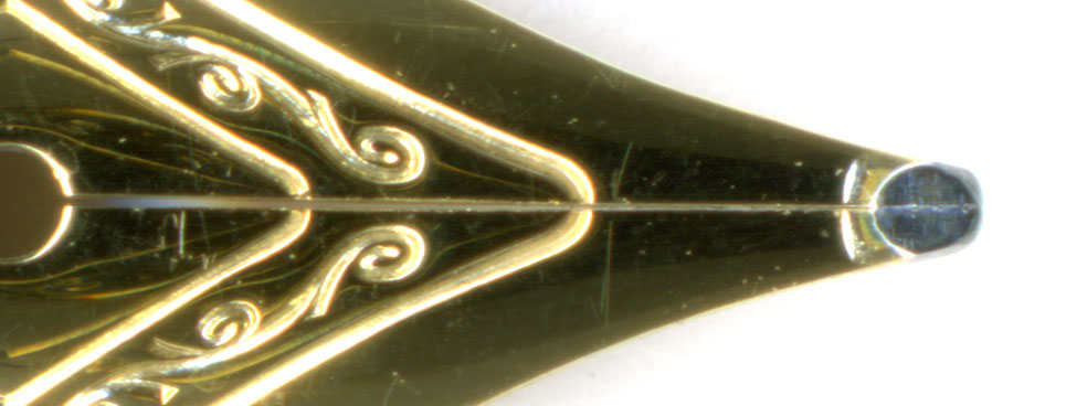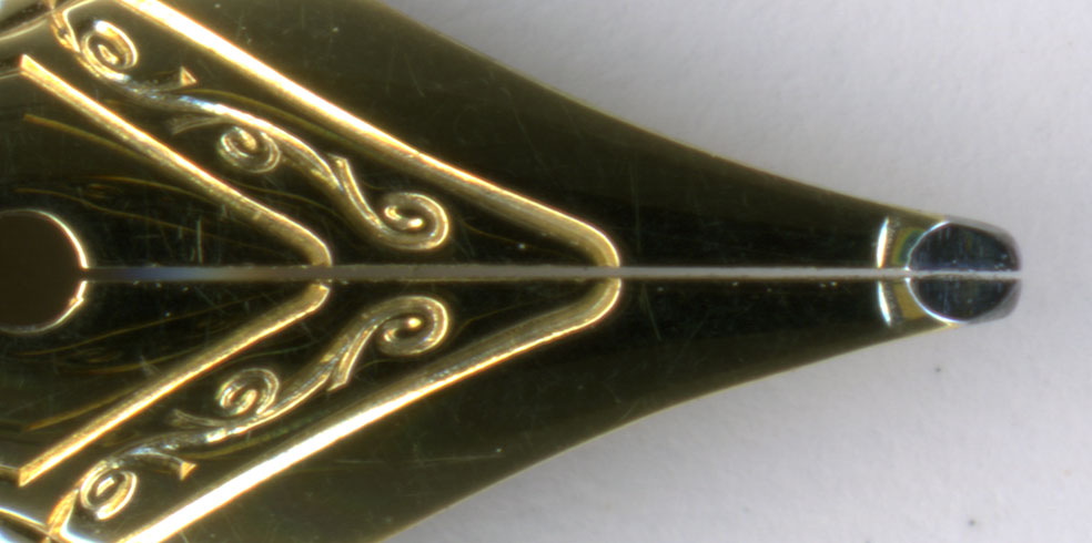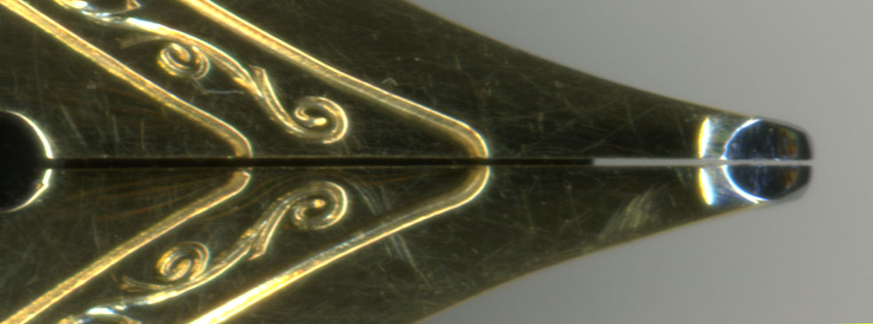 こちらがペンポイント近辺の拡大図。ペン先が開いていると、インクがペン先に来るまでの時間が若干長くなる。毛細管現象は狭い場所ほど速度が速い。ただし吸入式萬年筆や、コンバーターを使う場合、インク吸入が終了した時点でペン芯にはタップリとインクが含まれているので、毛細管現象でインクを素早く引っ張る必要はない。隙間を狭くすることに血道を上げるよりも全体としてのインクフローを考えるべき。