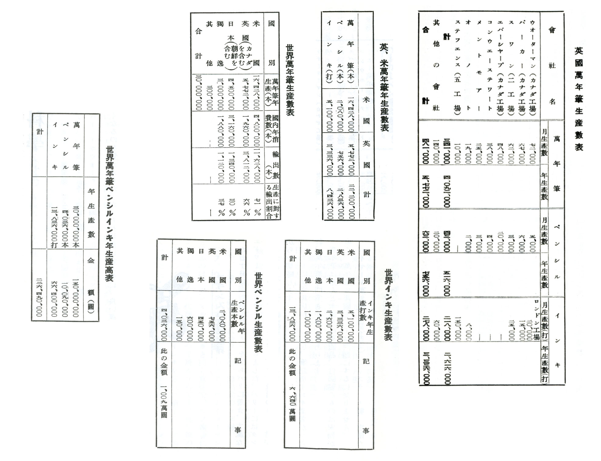 左は当時の英国連邦の萬年筆、ペンシル、インキの製造量の想定、米英のそれぞれの生産量、日本や独逸を含む世界の萬年筆製造数、その輸出割合、インキやペンシルの国別生産数、世界全体の統計を一表にまとめたものじゃ。驚いたことに、当時の日本は独逸よりも萬年筆製造本数は多かった!