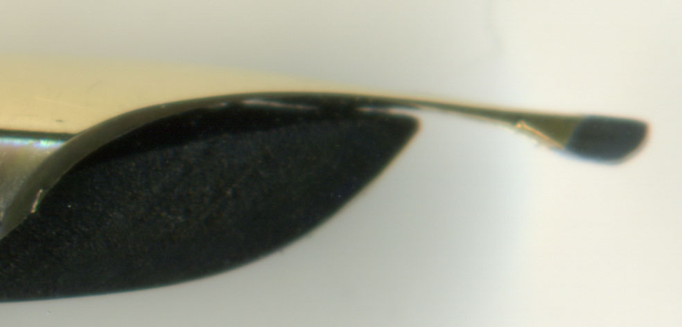 ペン先先端部の金の薄さと、それにぶら下がっているペンポイントの大きさのアンバランス感・・・しかもペン先自体の弾力が無くなっているので、安易にペン芯と密着させられない。これ以上の微調整でペン先にストレスをかければ、ポロっとペンポイントが脱落しそう・・・