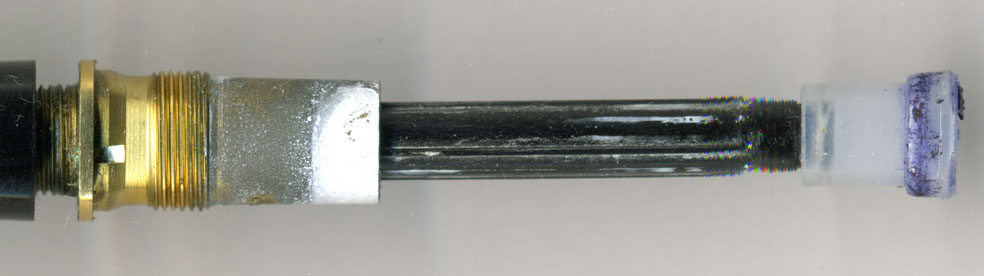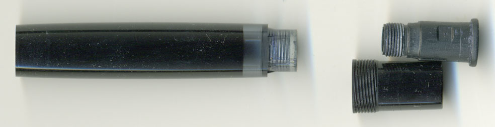 右上画像の胴軸先端の透明樹脂部分に大きなクラックが入っている!これがインク漏れの原因じゃ!ただし首軸先端の部品が完璧ならばそれほど多量に漏れはしないはずだがな?と考えてチェックしていたら・・・