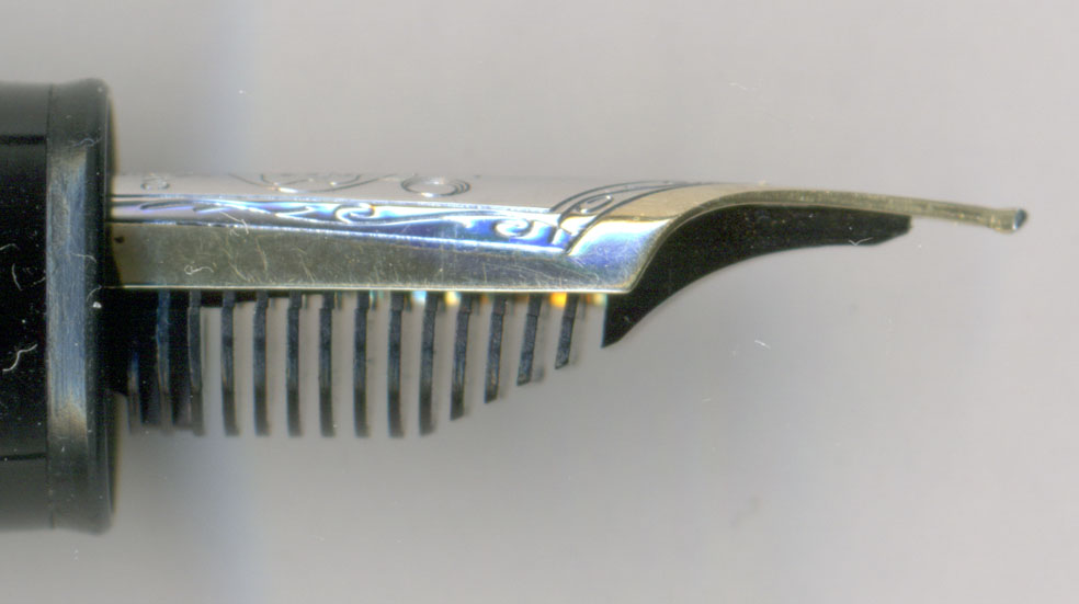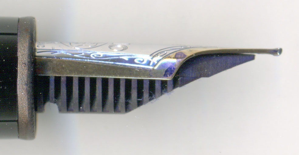 以前の利用者が相当にペンを立てて書く人だったのであろう。そこでペン先を多少反らせ気味にして、ペンポイントのおいしい所が紙に当たるようにしたのかな?ただその際にペン芯とペン先の乖離を計算に入れてなかったのかも・・・![]()
