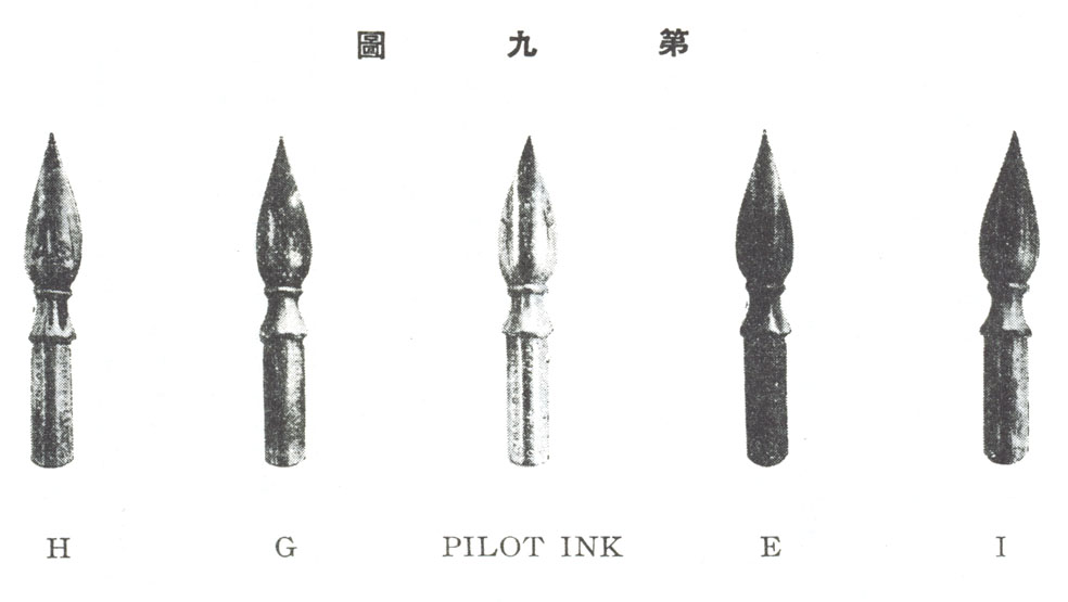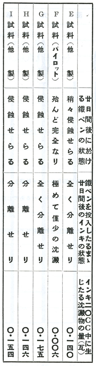 当時の印刷をそのまま複写して掲載した物を、さらにスキャナーで取り込んでいるので、他社製インキに浸した鉄ペンの浸食具合の差はよくわからないが、パイロット・インキに浸した物だけは、白いままで一切冒されていないのがわかる。