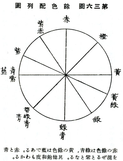 左は補色配列図(当時は余色配列図と呼んだ)じゃ。スペクトルにおける色の順序に沿って各色を円周上に配列した物だが、対角線上の両端が補色関係にあることを示している。