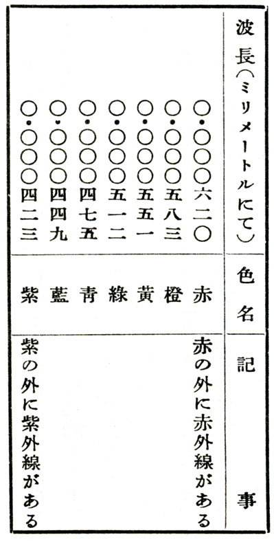そして太陽光線中の7色を全部平均に反射するものは白く見え、全部吸収する物は黒く見え、ある色だけを選択吸収して他の色を通過または反射する場合は吸収された色が表れるのじゃ。