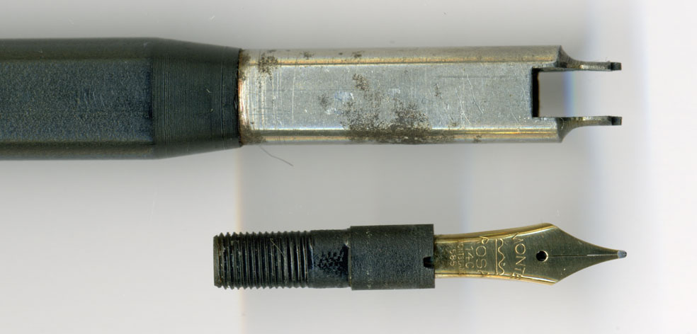 修理が完了した状態がこちら。どちらか一方だけ曲げて合わせても、どうしても無理が出る。ペン芯の先端部とペン先伸したとは密着するが、その後側に隙間が出来て、インクがボタ落ちしやすくなる。