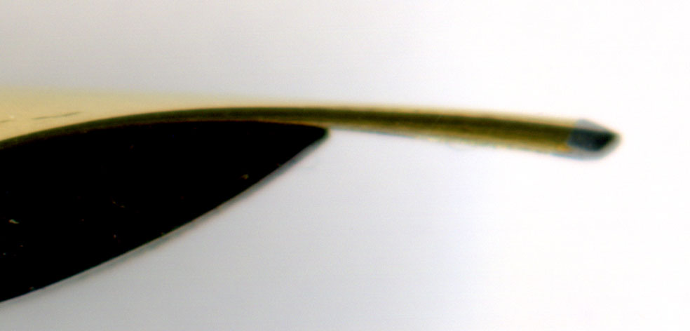 こちらが調整後のペン先先端部の拡大画像。スリットはホンの少し拡げておいた。
