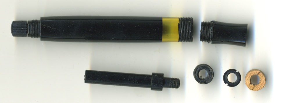 右から3個目が劣化して縮んだコルクで、右端が新品。真ん中はコルクを中軸に固定する部品。コレが無くなると死んでしまう・・・という万年筆にとって心臓のような部品じゃ。