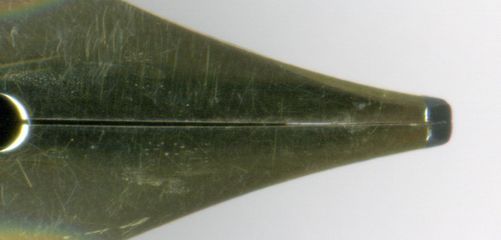 依頼人は筆圧が低い。従ってこのスタブの研ぎは最高に書きごこちが良いはずじゃ。ただし、ペンポイントの表面はいくら磨いてもツルツルにはならない。どうやらこの時代に特有のクレーターになりやすい粗悪な材料を使っているのであろう。
