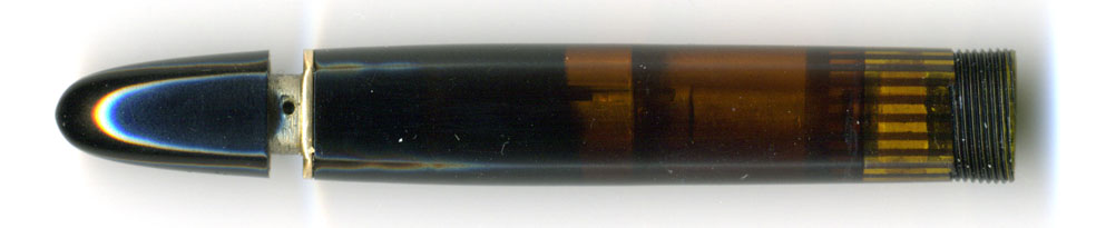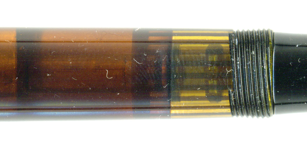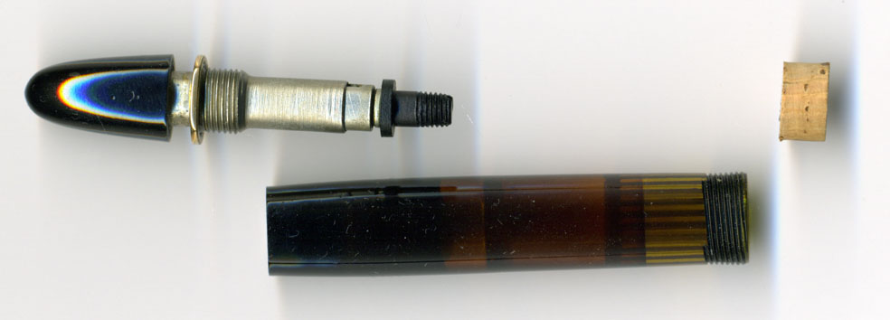 不具合はインク漏れ。しかもピストンの後側へインクが回り、尻軸のところからインクが漏れるというもの。画像では古いコルクを外しているが、こういう場合はコルクが収縮して胴軸内部とコルクとの間に隙間が出来、そこをすり抜けてインクが後ろに回るというもの。ある種、宿命だが、座敷牢に収納する時に内部に水を充填し、コルクが乾燥しない状態にしておけば長持ちする。インクを少量残したまま乾燥させてしまうのが最悪じゃよ。