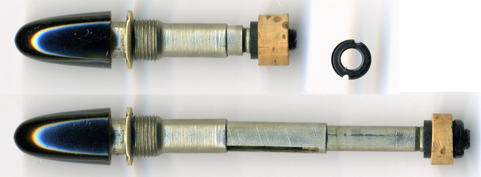 ここから先は直し方を伝授。まずは左画像。これはコルクとピストンと胴軸の関係を表している。ピストンは後側から専用工具を使って外す。コルクはNo.146専用のコルク(独逸から通販で入手)を胴軸内径よりやや細い状態にサンドペーパーで削る。