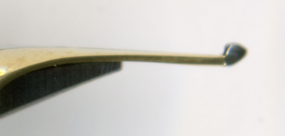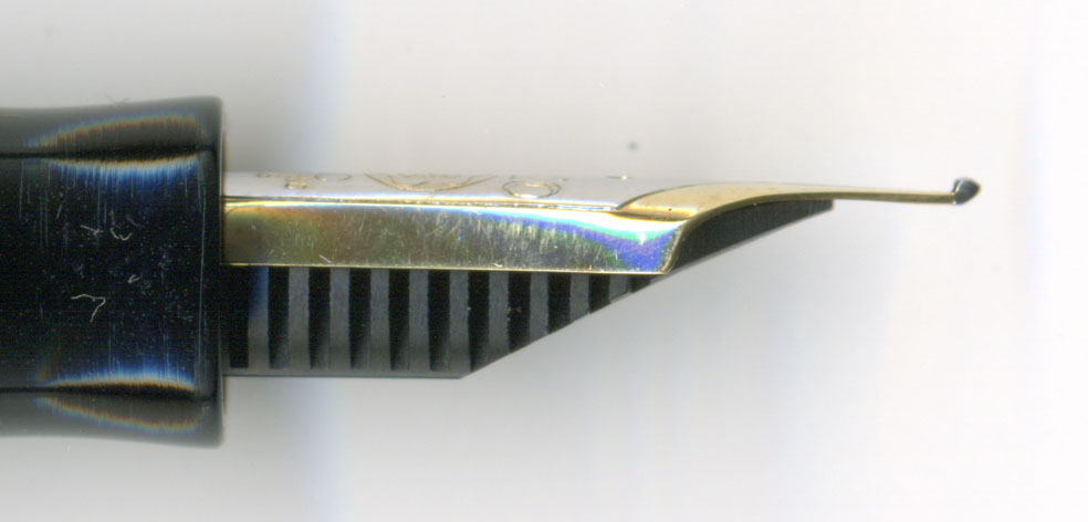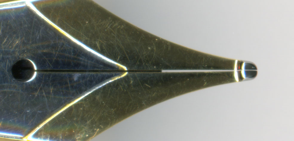 横から見ても、ペン先の状態には問題がない。ペンポイントもクーゲルらしくなっている。このペン先の厚さであれば、紙にペンを置いた瞬間の感触はふぅうわっとして最高であろう。拙者自身はクーゲルの書き味は好きではないが、紙当たりの感触には一目置かざるを得ない。