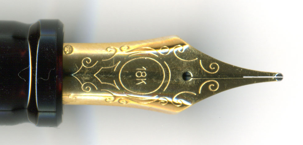 こちらがペン先。18K-Mのペン先じゃ。オプティマの初期モデルには模様がシンプルな14Kのニブがついていたので、これはAurora 88の初期の尖ったペン先を換装したのだと考えたが、あちらは14Kのペン先。といって当時の18Kのペン先で尖ったものはコロンボとカルロ・ゴルドーニくらいしかないはず。