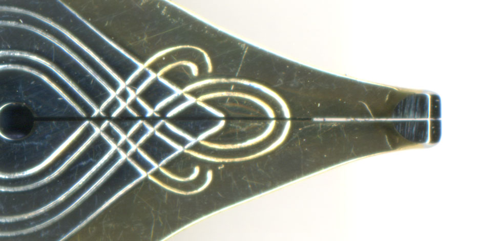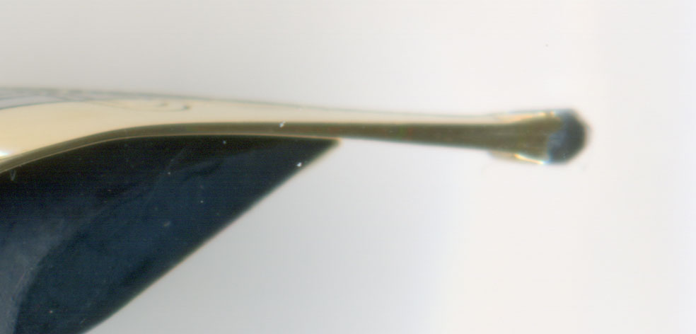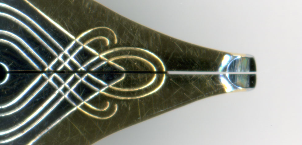 画像で見るとよくわからないが、ルーペで見ると、ペンポイントの腹を削ったな!としか思えなかった。ただ、削られたと拙者が考えている部分の仕上げがあまりに綺麗なので、メーカー以外がここまで出来るかな?との疑問もあった。