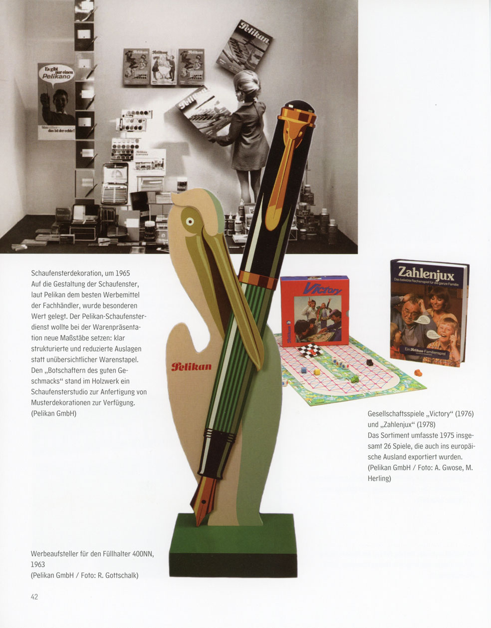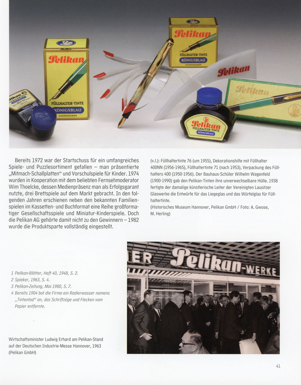 42頁の写真はショーウィンドーのデコレーション。ショーウィンドー・サービスという部署があり、陳列モデルを作成するスタジオがあったそうです。43頁上は当時の万年筆など(インクボトルの包装箱はバウハウス出身のWilhelm Wagenfeldがデザイン)。下は1963年、ハノーファーでのドイツ産業メッセでペリカン・スタンドを訪れた経済大臣ルードヴィヒ・エアハルト、このあとすぐに連邦首相に就任します。以上、こんなところで。ではまた。
