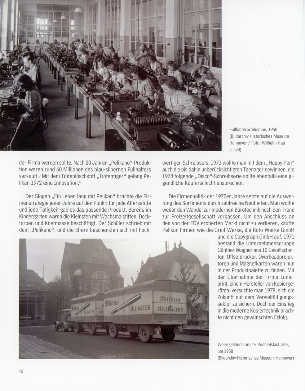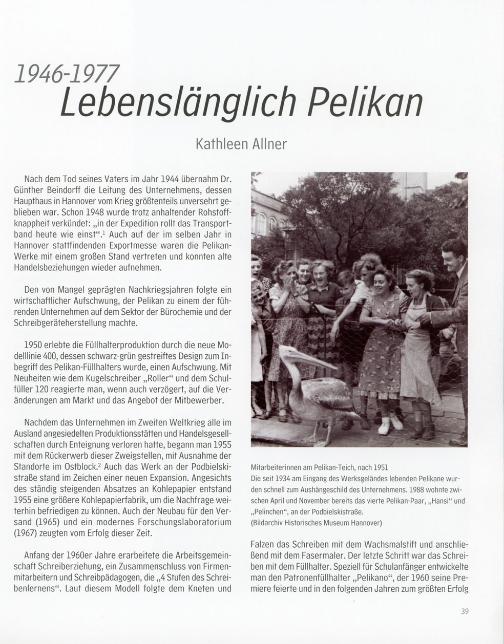 最初の頁の写真は、ご指摘通り、1934年以来敷地にあるペリカン池の前に集まった女性社員たちだそうです。ペリカンはペアで飼われていたらしいですね(1988年に4代目ペア)。それにしても、次の万年筆生産工程も含め、女性従業員の写真ばかりですね。偶然なのか、実際に女性が多かったのか・・・。さて、全体のテーマは、戦後の復興期から、「一生、ペリカン!」をスローガンとしてすべての年齢層に合わせた製品ラインを揃えようとしていた時代についてです。